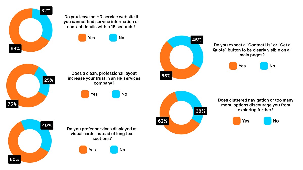 To validate the qualitative findings and support design decisions with data, I conducted a quantitative survey among 50 working professionals and business owners who frequently interact with HR service or staffing websites. The goal was to measure common behaviors, expectations, and preferences related to navigation, layout, and trust signals. Survey was focused on binary (Yes/No) questions to keep responses clear and measurable.