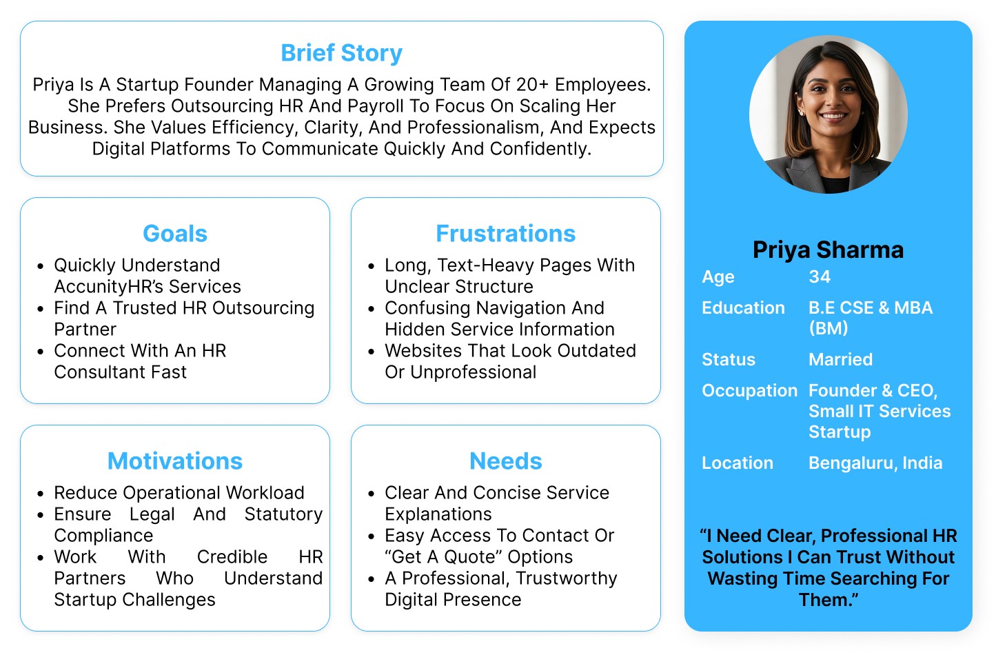 Users can’t easily understand what accunityHR offers and how to access services, leading to high bounce, low conversions, and weak brand trust.