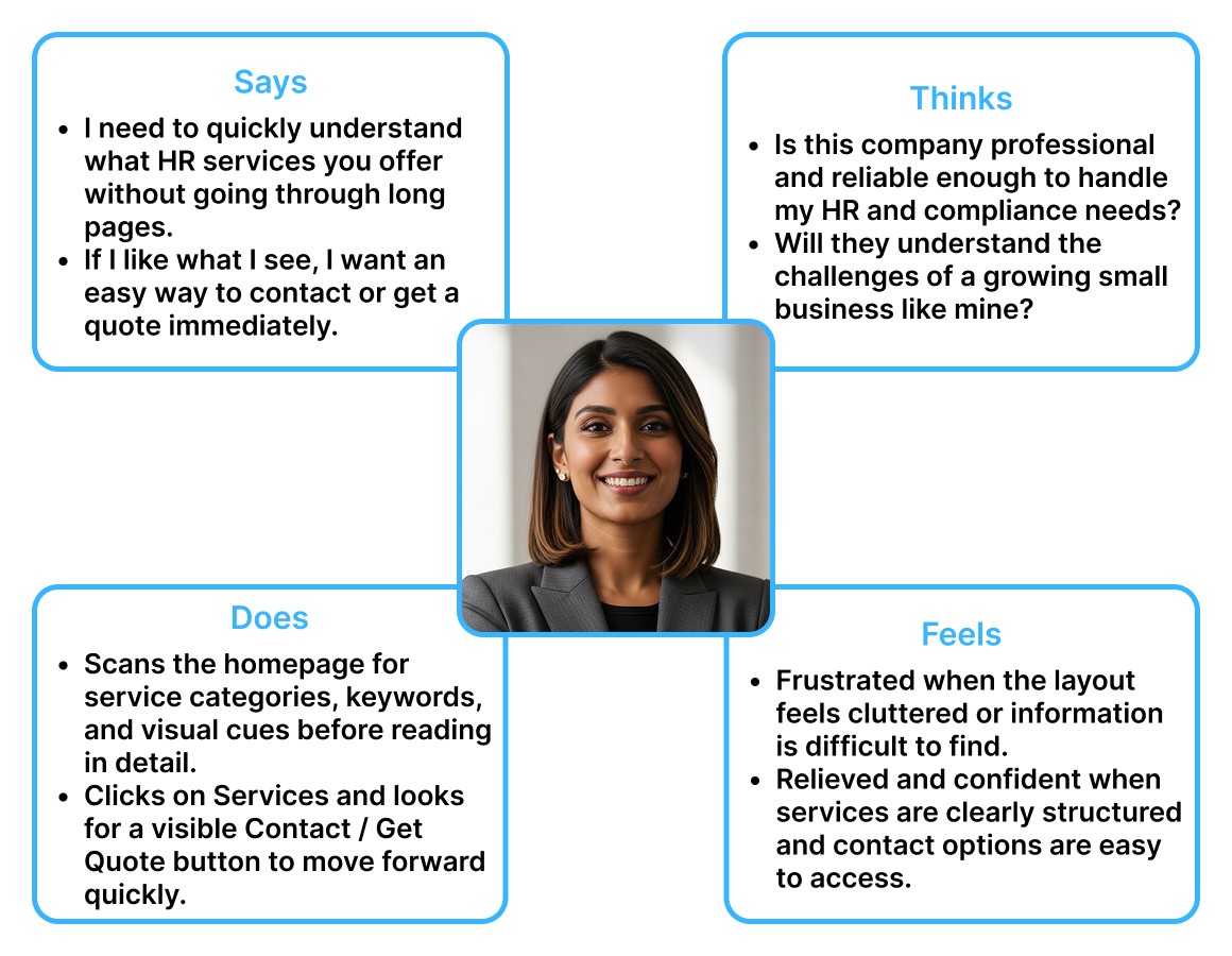 HR Managers & Business Owners: 30–50 yrs, looking for outsourced HR/compliance support, expects clarity on services & easy contact.