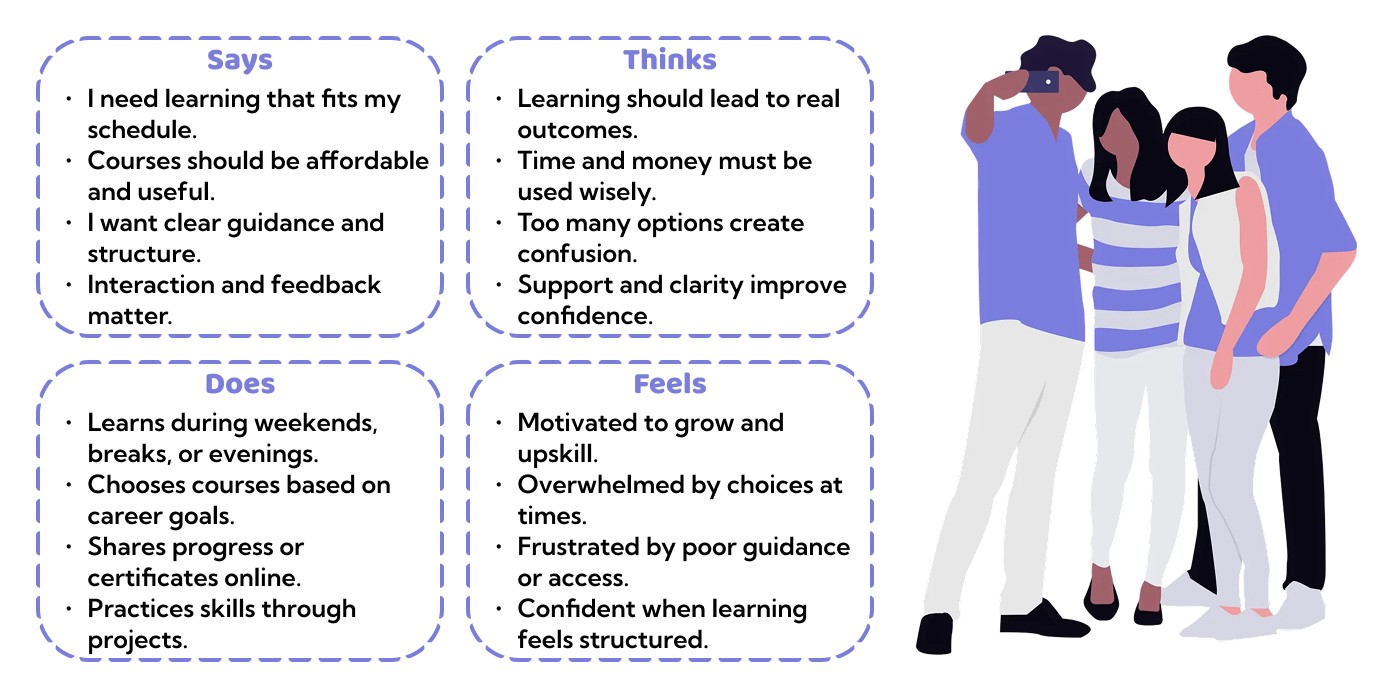 Learners and trainers using existing online learning platforms often face fragmented learning experiences due to poor navigation, limited interaction, unreliable internet access, and complex course management tools. Students struggle to stay engaged, clarify doubts in real time, and access content consistently, while trainers find it difficult to manage courses, assignments, and learner progress efficiently on a single platform.