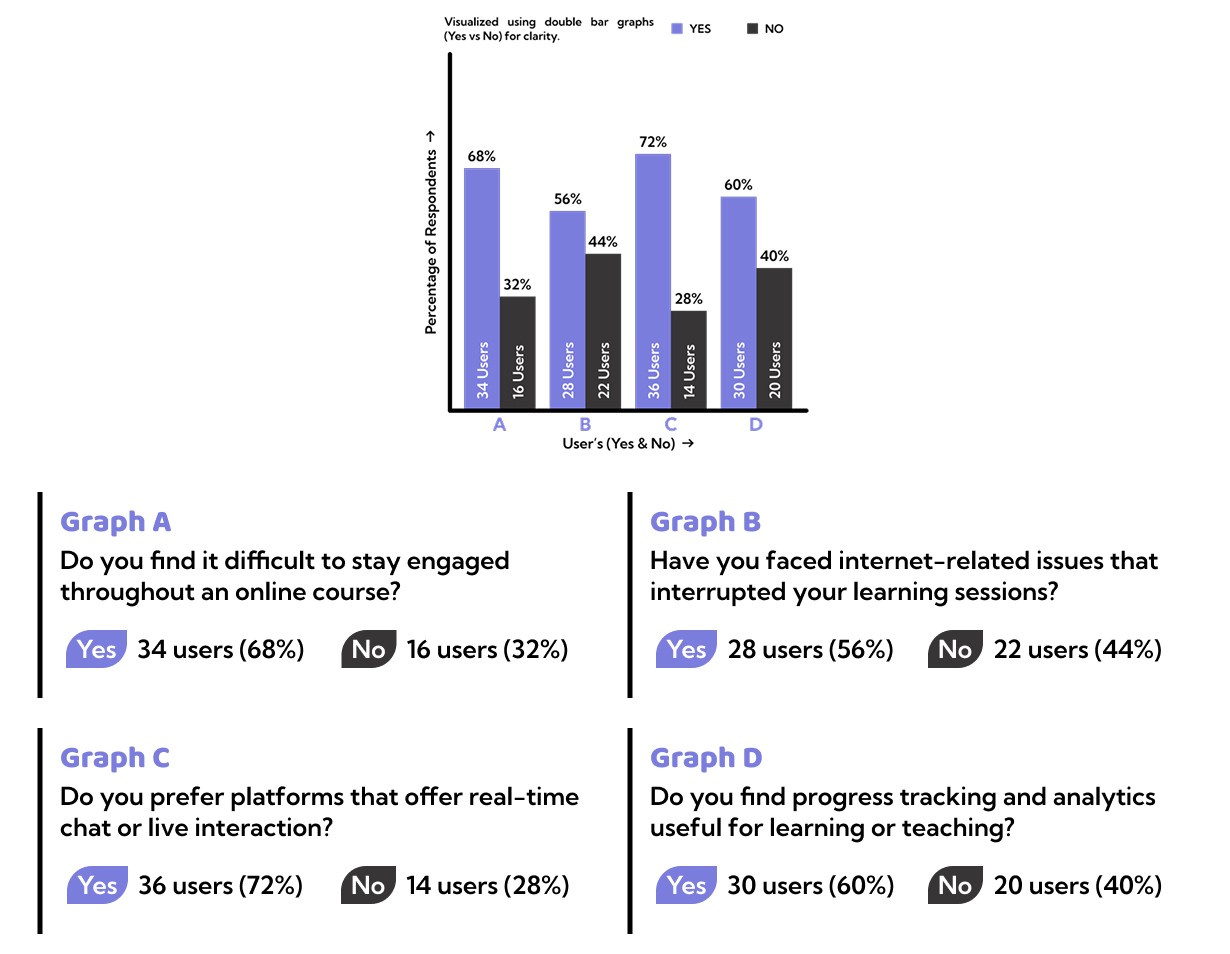 To validate the qualitative insights, I conducted a structured online survey with learners and trainers who actively use online learning platforms. The survey focused on engagement levels, internet reliability, communication needs, and progress tracking. Responses were collected using close ended (Yes/No) questions to identify clear patterns and measurable trends. Total participants: 50 users (38 learners, 12 trainers)